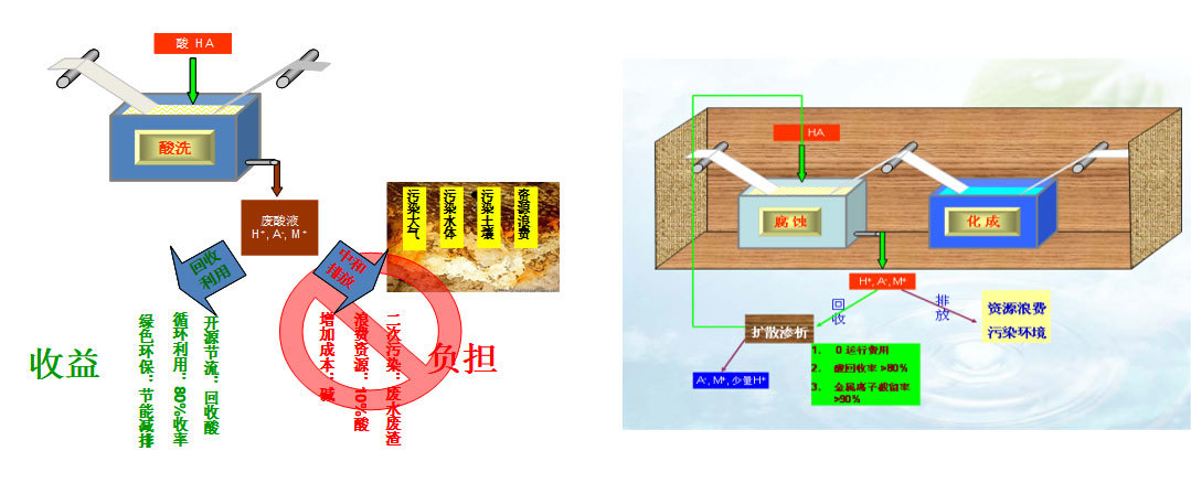 回收酸可用于新產(chǎn)品開發(fā),也可蒸發(fā)濃縮回用到前序生產(chǎn)過程中,大幅度降低廢酸排放量,減少了中和用堿的量,整個(gè)過程無新污染物排出,工藝綠色環(huán)保。