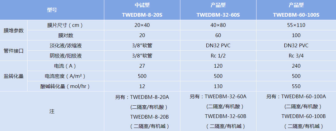 包括三隔室雙極膜電滲析器和二隔室雙極膜電滲析器兩種;三隔室雙極膜電滲析器適用于將無機鹽轉化為對應酸和堿,膜對由雙極膜、陽離子交換膜和陰離子交換膜組成,包含鹽室、酸室和堿室;二隔室雙極膜電滲析器適用于將有機酸鹽轉化為有機酸和堿或將有機堿鹽轉化為有機堿和酸,膜對由雙極膜和陽離子交換膜(包含料室和堿室)或雙極膜和陰離子交換膜(包含料室和酸室)。 雙極膜電滲析過程以電場為驅動力,利用雙極膜解離水為H+和OH-的特性,將雙極膜與陰、陽離子交換膜組合成雙極膜電滲析系統, 實現將鹽溶液轉化為對應的酸和堿;該過程僅在電極室設置電極,僅在電極室產生氣體,運行能耗較低;該過程除電極室外,沒有電極反應,沒有氧化還原反應,不會產生目的物以外的物質。