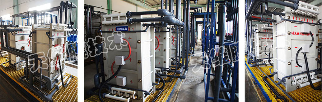 (1)有機酸生產:有機酸生產過程中需要轉化有機酸鹽為有機酸;傳統方法采用離子交換,離子交換柱再生過程消耗大量酸產生大量含鹽廢水;利用雙極膜電滲析水解離作為H+和OH-的供應源,可直接生產有機酸,無需外加酸,副產堿,簡化了工藝,避免了環境污染。 (2)食品醫藥工業:雙極膜電滲析水解離產生的酸和堿用于食品和醫藥行業生產過程中的pH值在線調整,無需外加酸和堿,不引入外來成分。 (3)環境保護:雙極膜電滲析水解離作為新型膜分離過程,可在不引入新組分的情況下將水溶液中的鹽轉化成相應的酸和堿,為某些物質資源的再生和回收、減少廢物排放、消除環境污染提供了新的途徑 項目現場